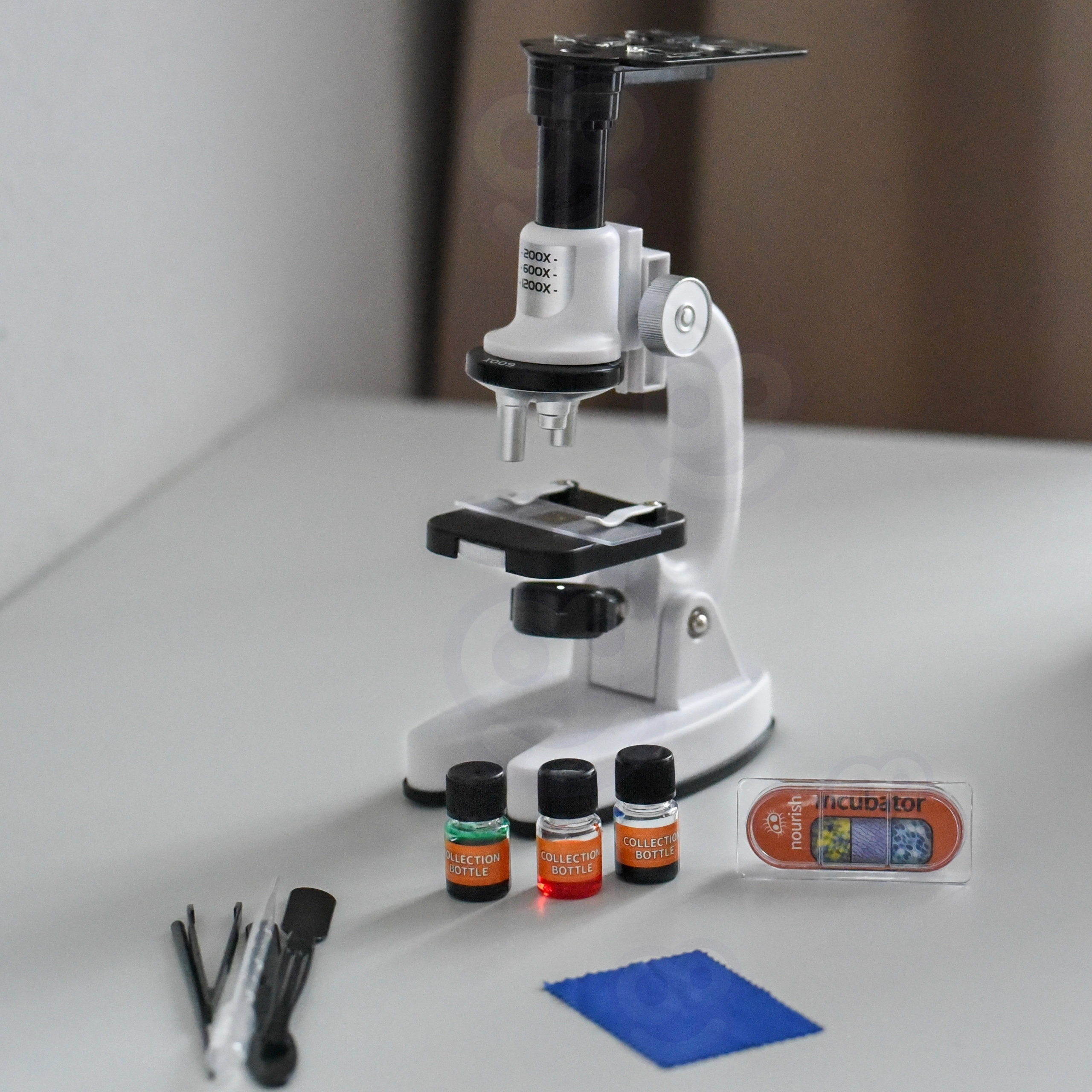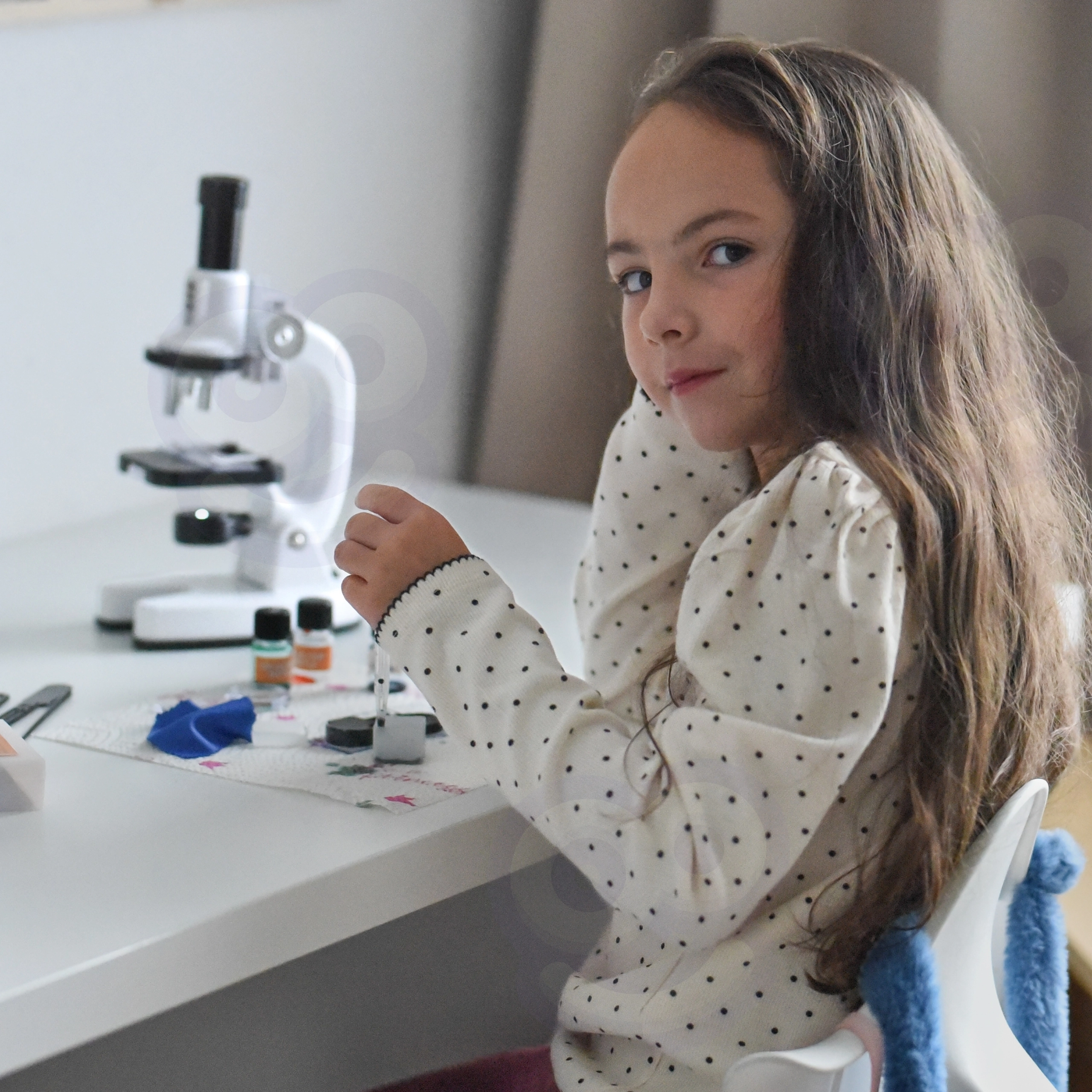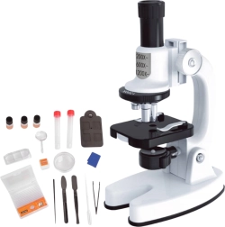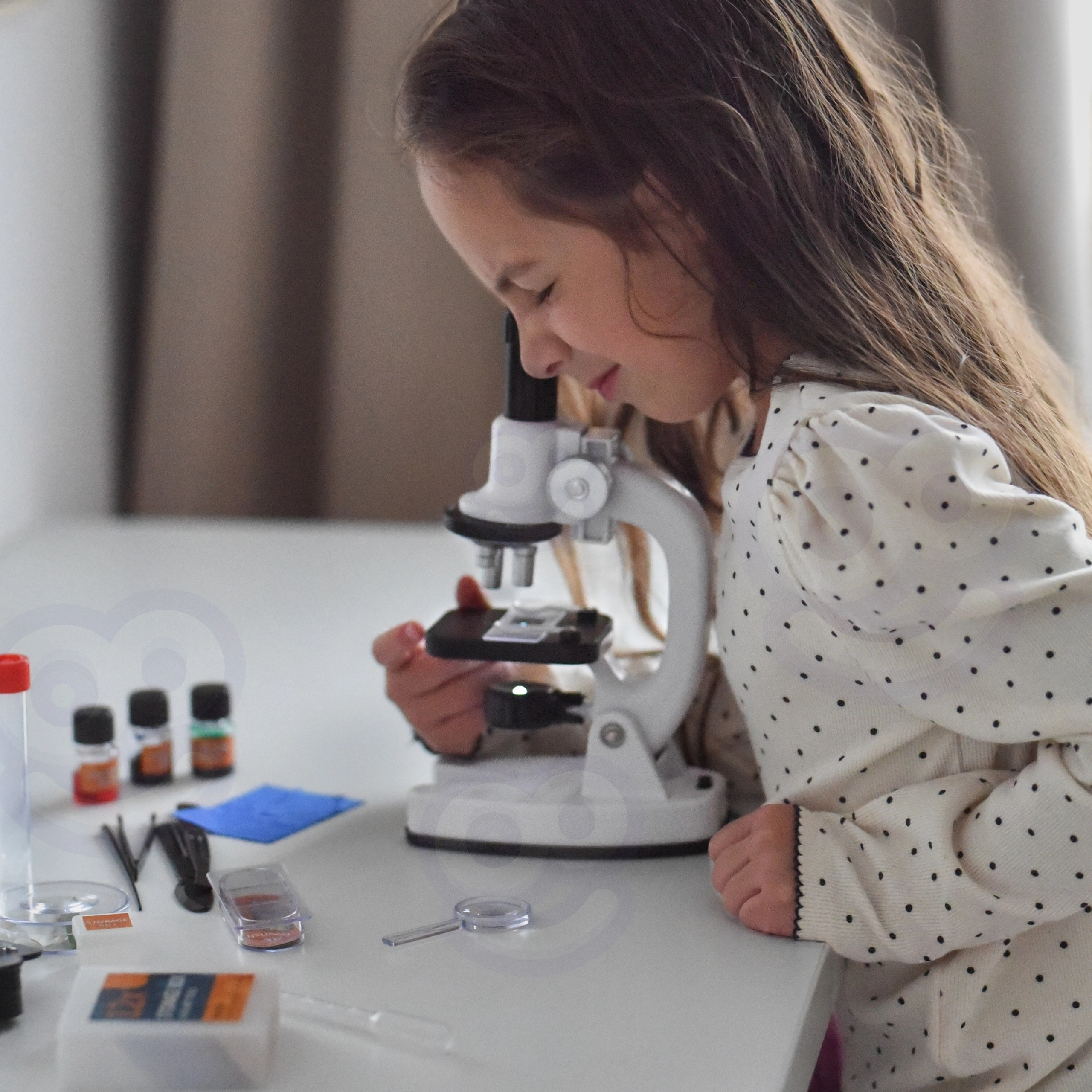 Dieses kompakte Mikroskop ist die perfekte Wahl für das erste Heimlabor. Dank der drei Vergrößerungsstufen 200x / 600x / 1200x, der integrierten LED-Beleuchtung und dem drehbaren Farbfilter erkennen Kinder leicht die Strukturen von Pflanzenzellen, Fasern und feine Details kleiner Proben.