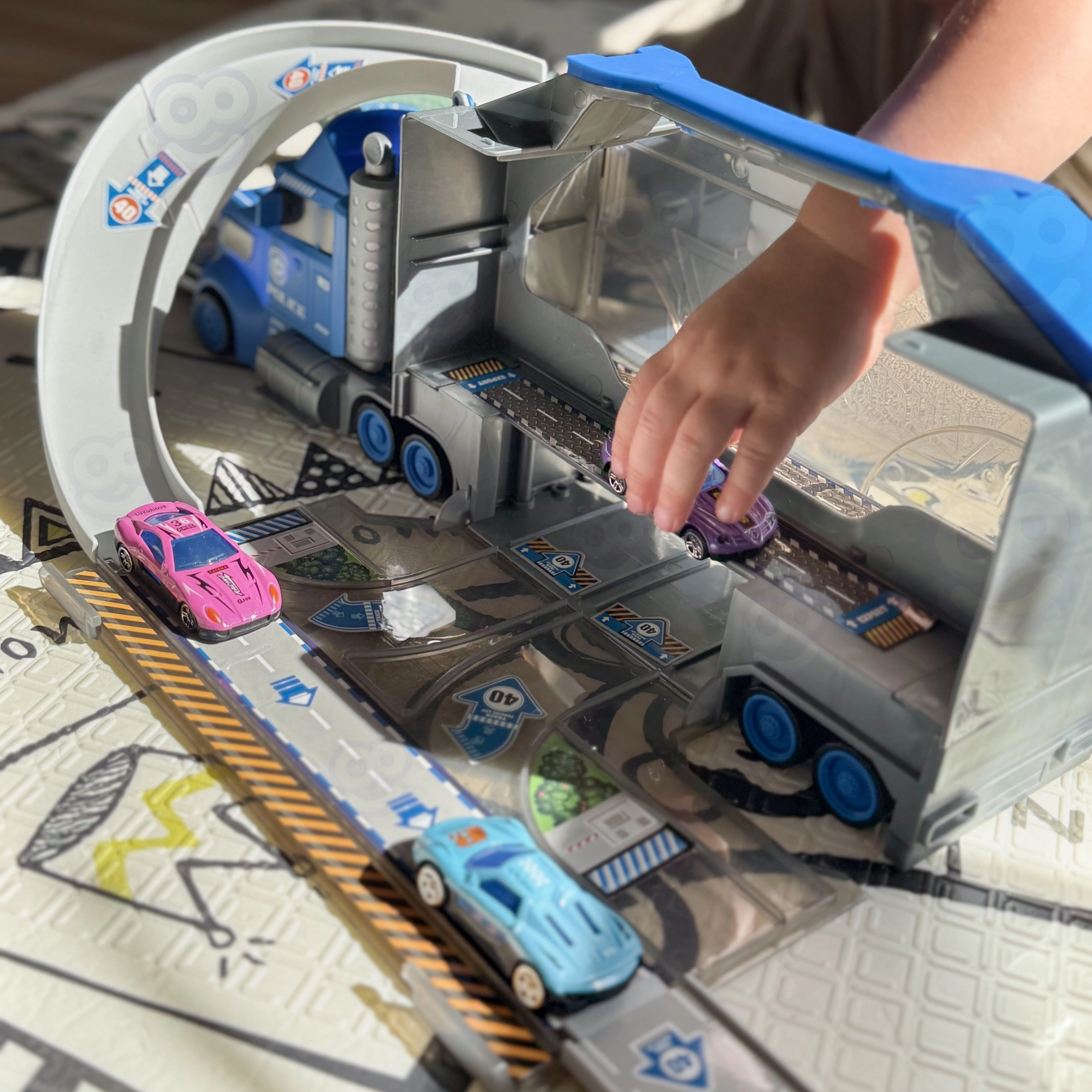 Der Lastwagen funktioniert als mobiler Transporter und als tragbarer Koffer für Autos und Zubehör. Kinder können so das gesamte Set überallhin mitnehmen.