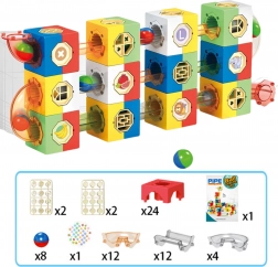 Verbinden Sie Bausteine und transparente Röhren zu eigenen mehrstöckigen Bahnen. Kinder entwickeln Kreativität, Logik und Planungsfähigkeit.