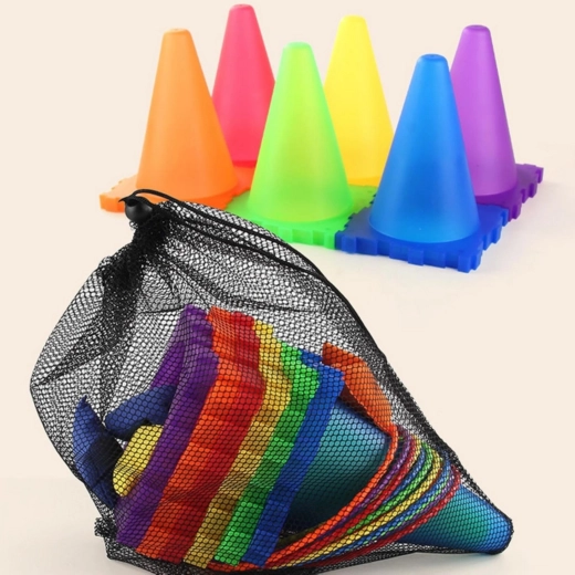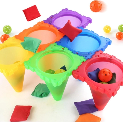 Leuchtend farbige Kunststoffkegel, perforierte Bälle und weiche Säckchen sind kindgerecht, leicht zu transportieren und halten häufige Nutzung im Freien wie zu Hause aus.