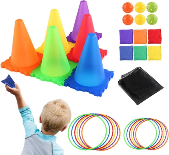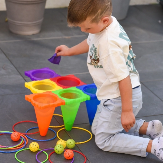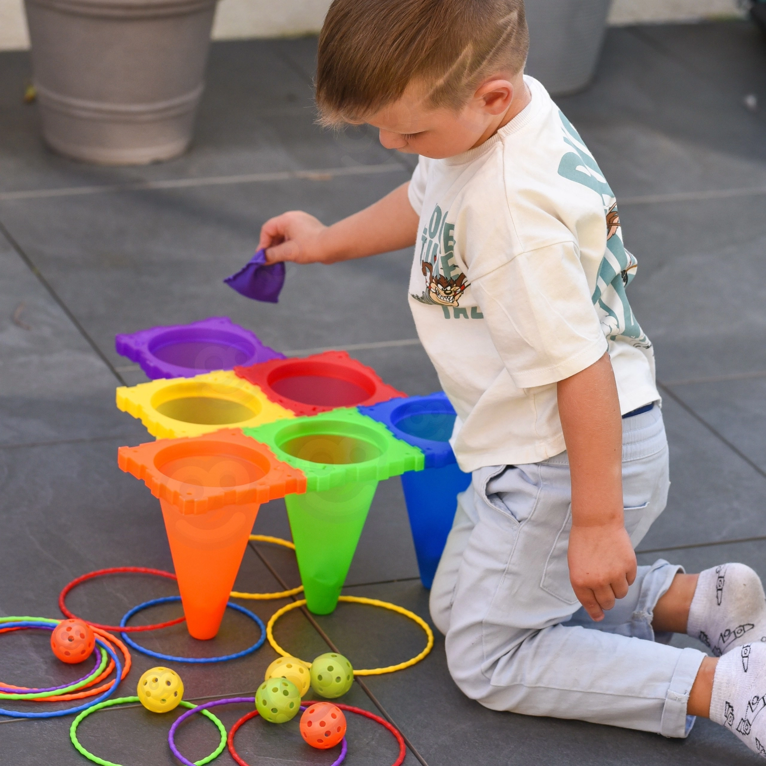 Im Set ist alles für drei beliebte Spiele enthalten: Ball Toss in die Kegel, Bean Bag Toss auf Ziele und Ring Toss auf die Kegel. Dank der leichten und sicheren Konstruktion geeignet für Outdoor und Indoor. Leuchtende Farben erhöhen die Sichtbarkeit und motivieren zur Bewegung.