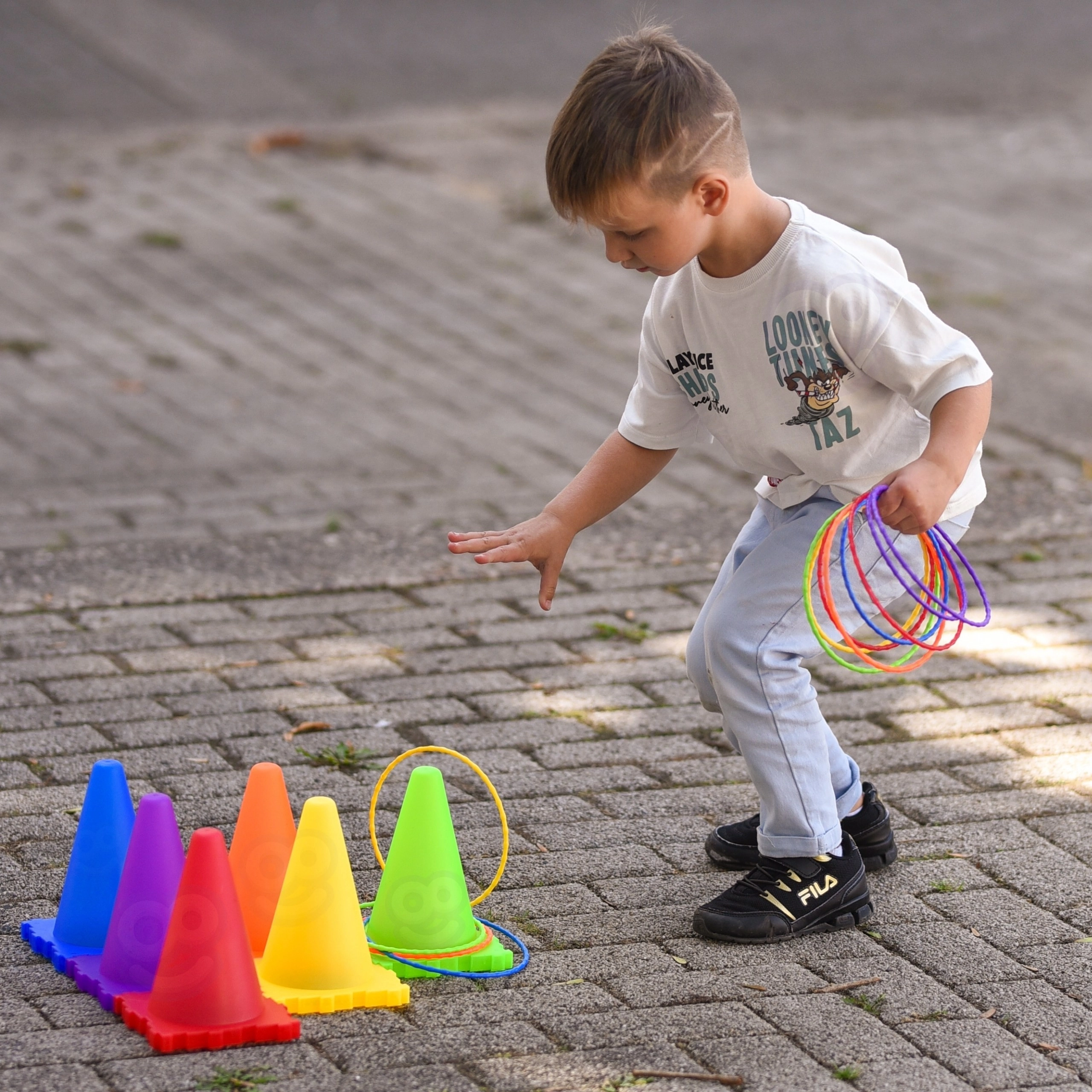 Genießen Sie aktive Unterhaltung für die ganze Familie mit dem universellen WOOPIE 3-in-1 Set. Modulare Kegel mit Durchbrüchen und stapelbaren Basen erlauben verschiedene Anordnungen für Training von Zielgenauigkeit, Geschwindigkeit und Reaktion. Kinder üben Farben, das Zählen von Punkten und Teamarbeit – Erwachsene schätzen die Variabilität und das einfache Verstauen.