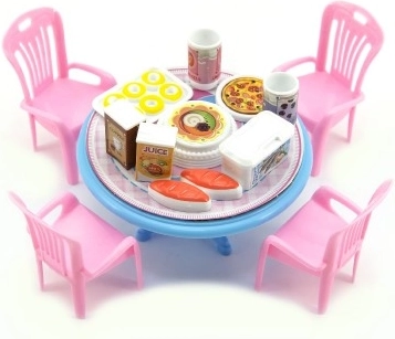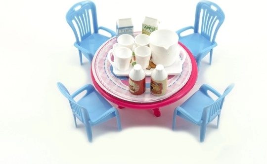 Dieses Puppenmöbel-Set bringt einen schönen kleinen Tisch mit Stühlen und kleinem Zubehör in die Spielwelt. Dank der kompakten Größe von 12 cm passt es perfekt zu kleineren Puppen und in Puppenhäuser. Die leichte Ausführung aus Kunststoff ist robust und pflegeleicht.