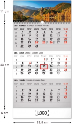 Notique Wandkalender mit Dreimonatsübersicht Landschaft, slowakische Namen 2026, 29,5 × 43 cm, grau