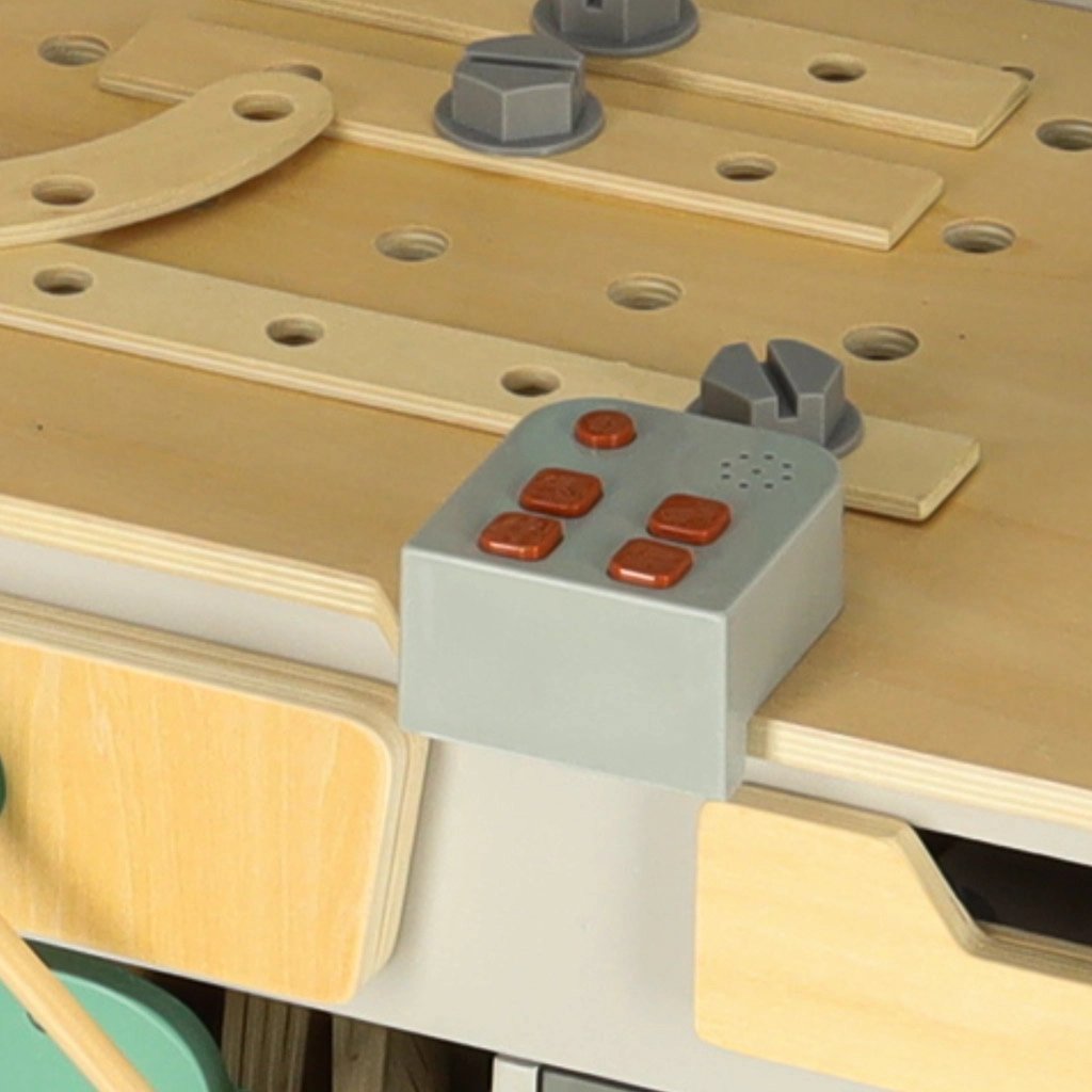 Bildungswert: Geeignet für den Einsatz in häuslichen oder schulischen Umgebungen, in denen die breite Auswahl an Werkzeugen unendliche Spielszenarien ermöglicht. Enthalten sind unter anderem ein Tisch, eine Säge, ein Schraubendreher, ein Hammer und vieles mehr, einschließlich einer Fernbedienung mit Soundeffekten.