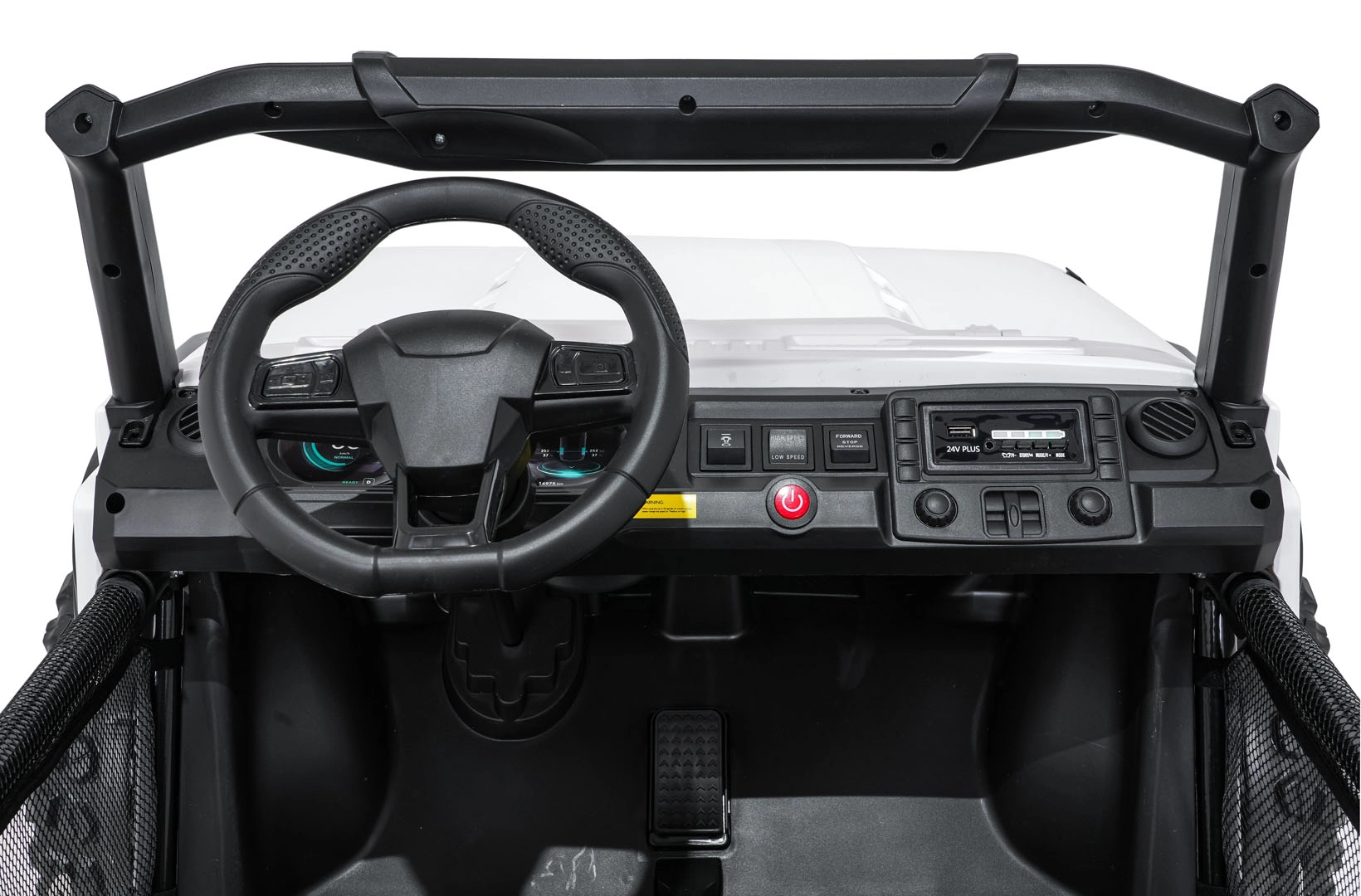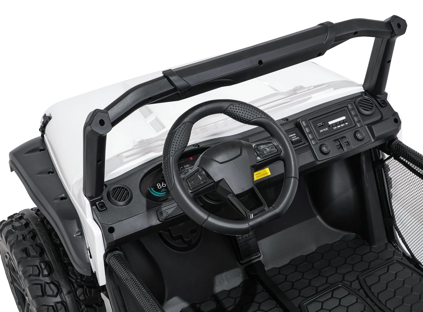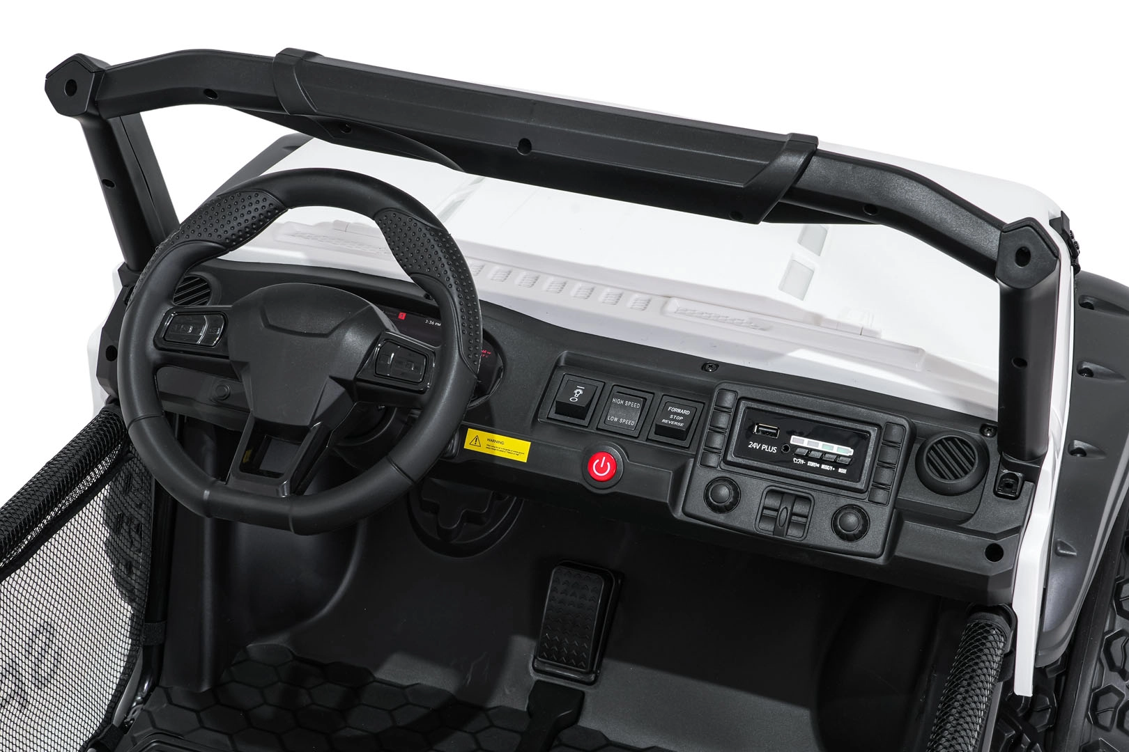 Junge Fahrer freuen sich über die umfangreiche Ausstattung: Multimediapanel mit MP3/USB/AUX und Bluetooth, Sounds und Hupe am Lenkrad, LED-Frontscheinwerfer und beleuchtete Motorhaube. Eltern schätzen die 2,4-GHz-Fernbedienung mit 3 Geschwindigkeiten, das sanfte Anfahren und den Sicherheitssstopp. Der zweisitzige Ökoleder-Sitz mit Gurten erhöht Komfort und Sicherheit.