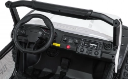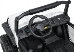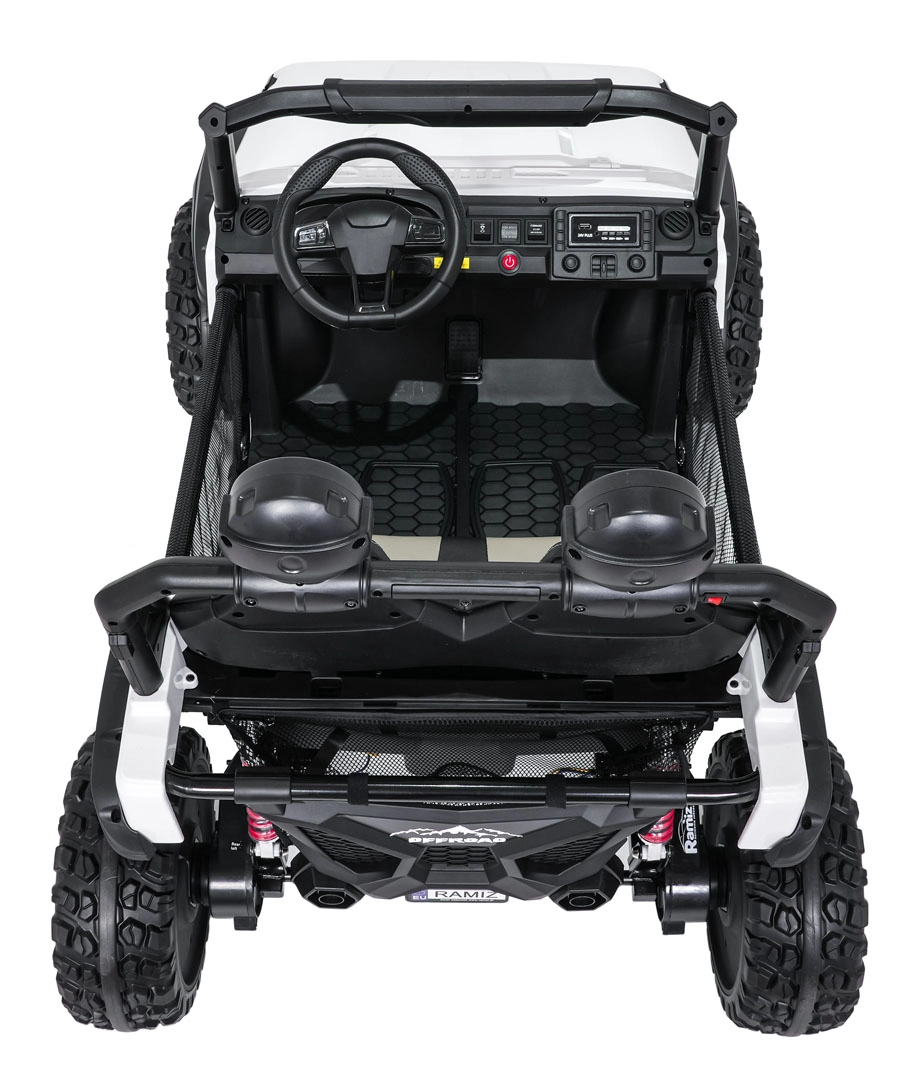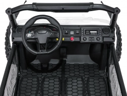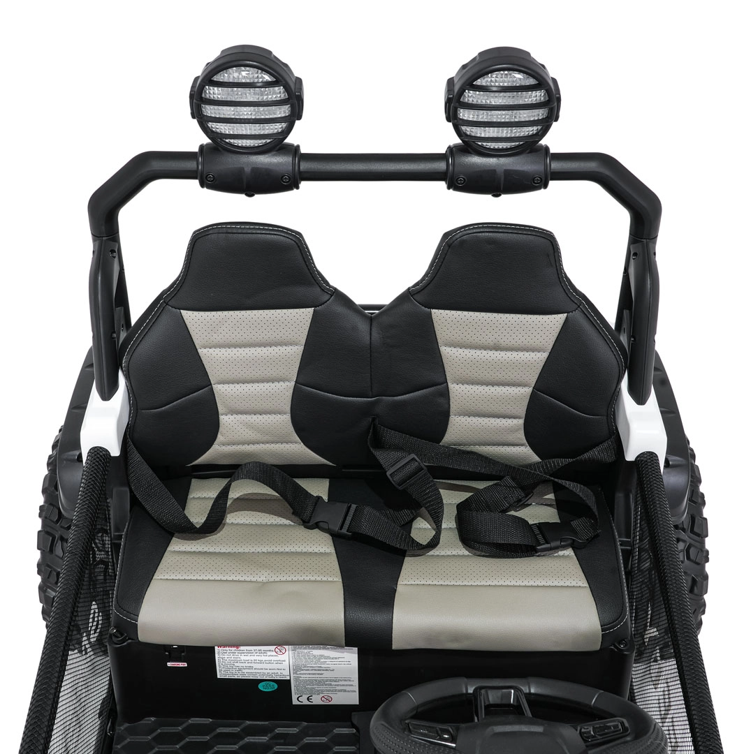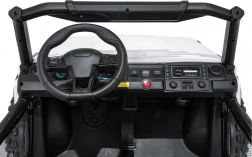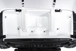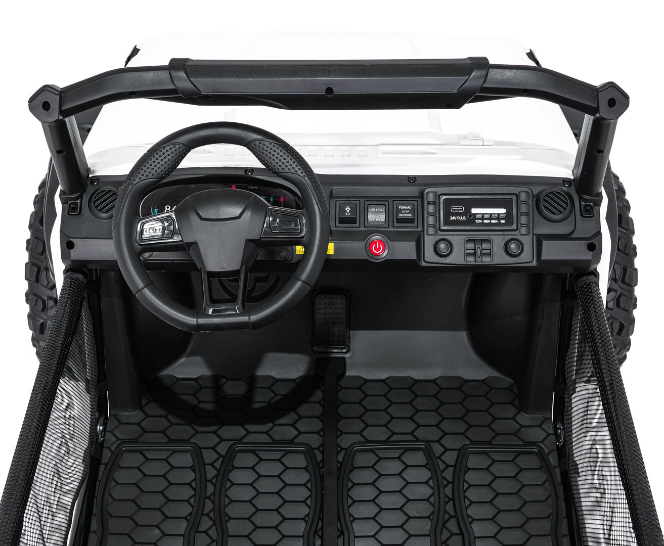 Junge Fahrer freuen sich über die umfangreiche Ausstattung: Multimediapanel mit MP3/USB/AUX und Bluetooth, Sounds und Hupe am Lenkrad, LED-Frontscheinwerfer und beleuchtete Motorhaube. Eltern schätzen die 2,4-GHz-Fernbedienung mit 3 Geschwindigkeiten, das sanfte Anfahren und den Sicherheitssstopp. Der zweisitzige Ökoleder-Sitz mit Gurten erhöht Komfort und Sicherheit.