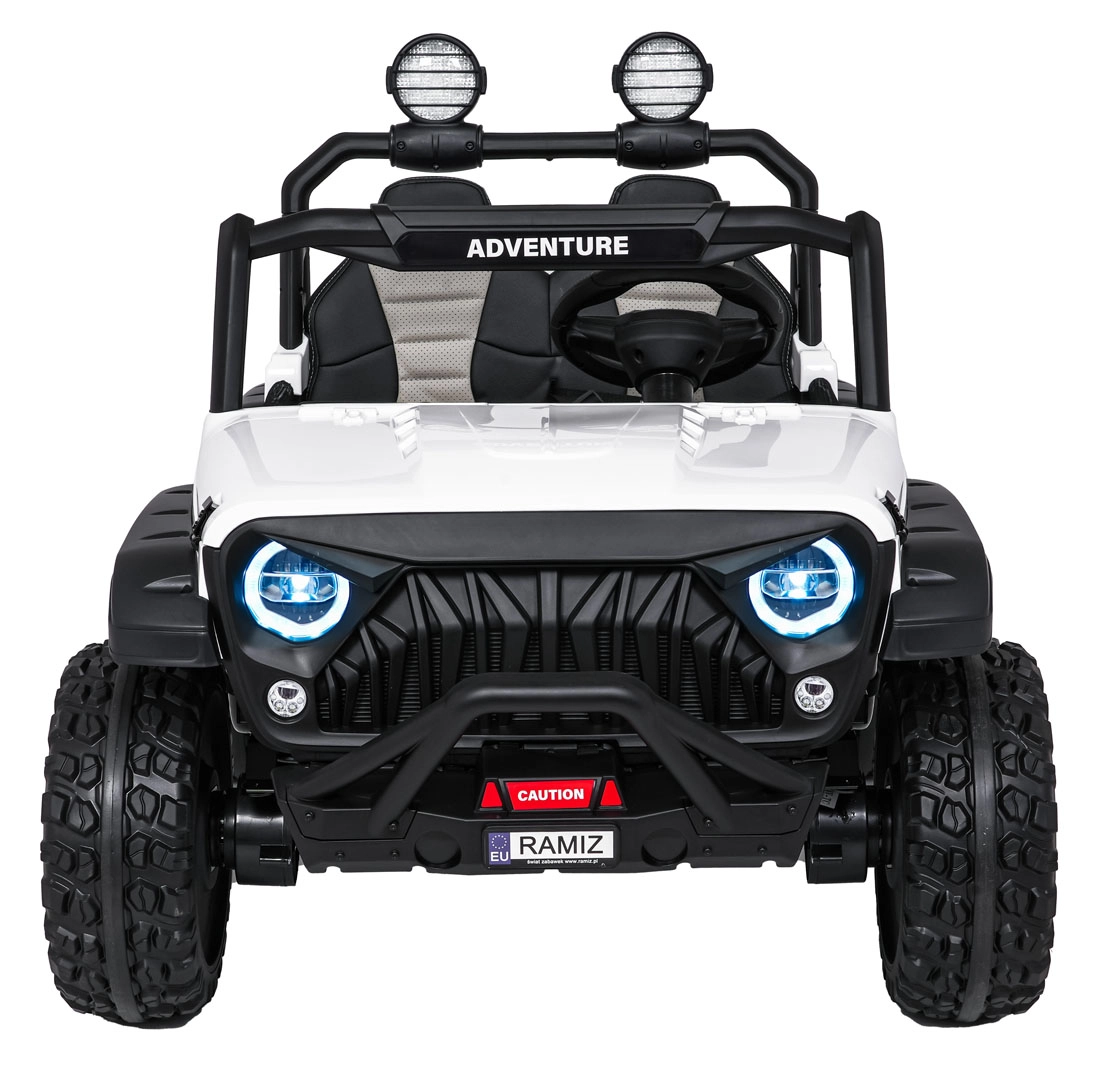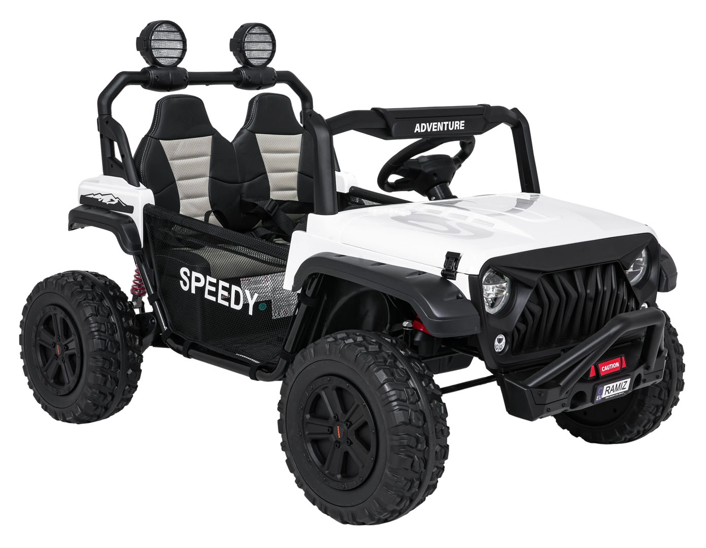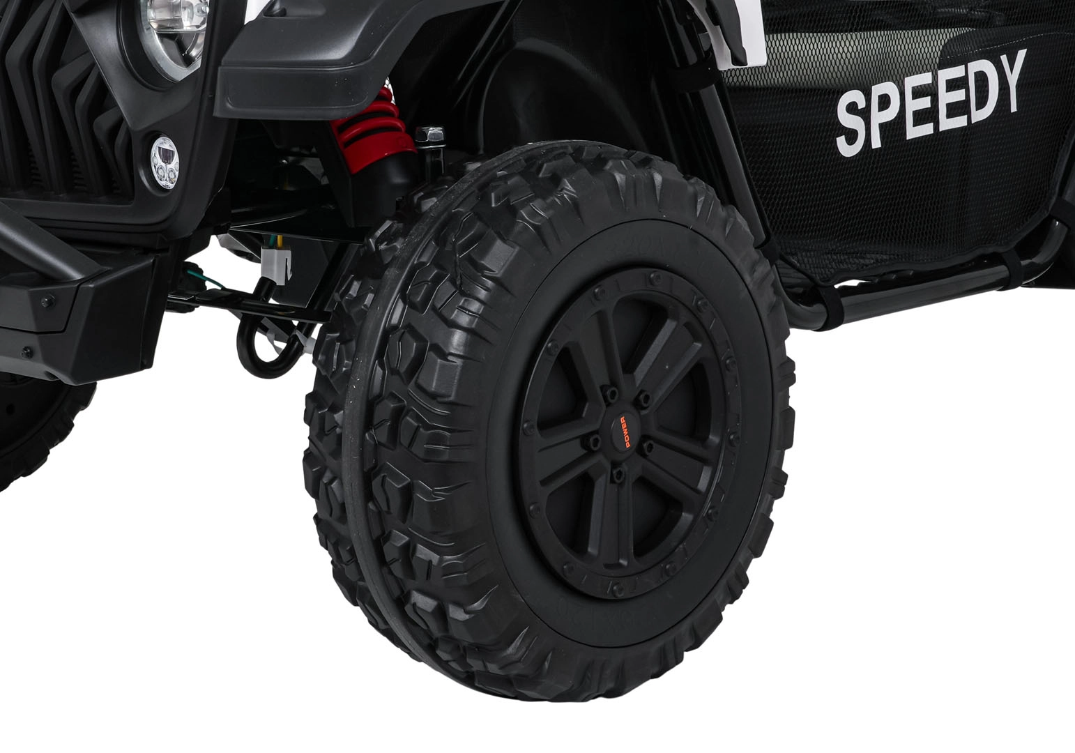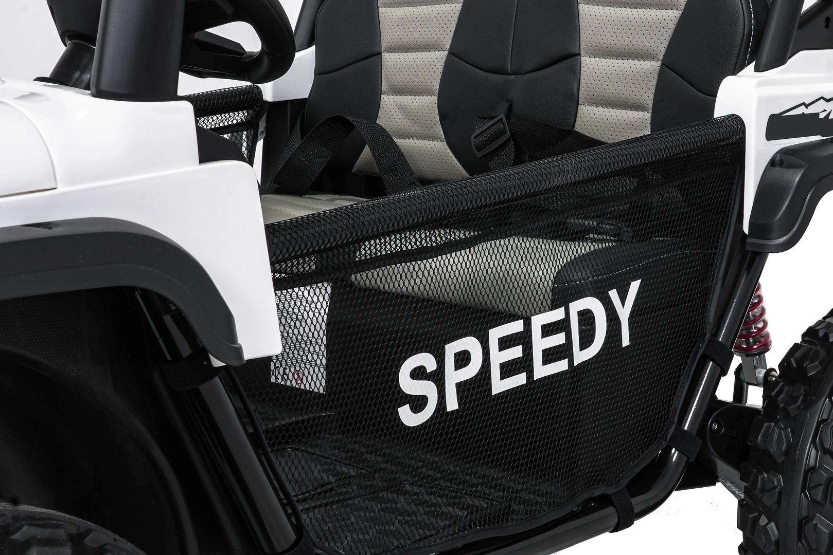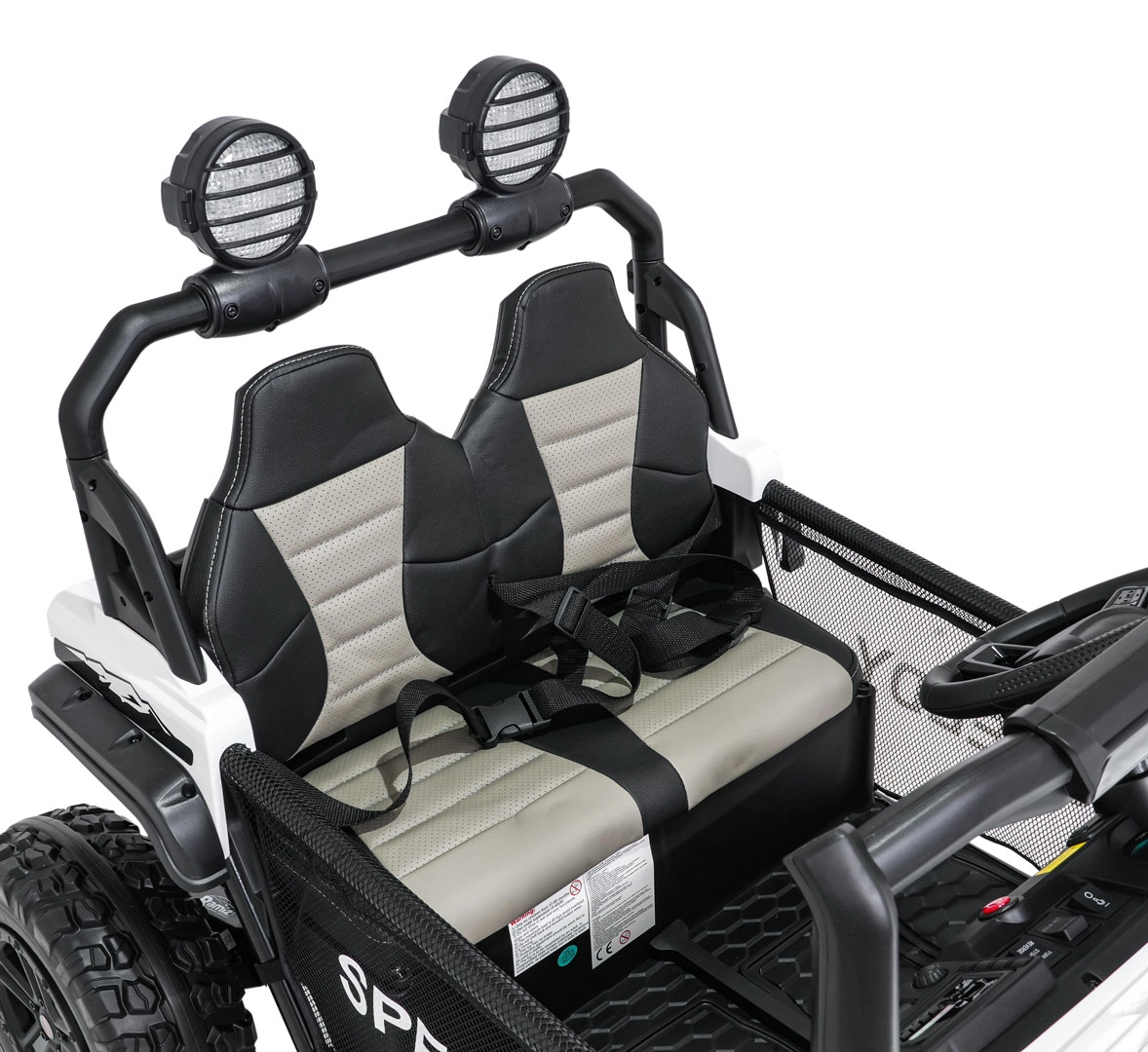 Der robuste elektrische Kinder-Geländewagen PASSION 4x4 bietet 4 Motoren mit 200 W, 24-V-Batterie, EVA-Schaumräder und einen zweisitzigen Sitz aus Ökoleder mit Gurten. Dank LED-Beleuchtung, sanftem Anfahren und 2,4-GHz-Fernbedienung mit Sicherheitstaste Stop ist die Fahrt sowohl spaßig als auch sicher.
