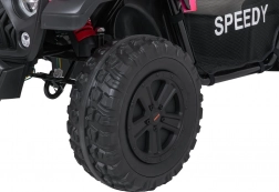 Vier 200-W-Motoren liefern die Kraft für Fahrten im Gelände, sanfte Anfahrten mit Soft Start und zwei Kinder-Geschwindigkeiten sorgen für sicheres und spaßiges Fahren vorwärts und rückwärts.