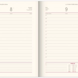 Eleganter rosa Kalender NOTIQUE Rivoli für das Jahr 2026, entworfen für moderne Benutzer. Enthält ein festes Gummiband, eine Stiftschlaufe und ein tägliches Layout mit einem tschechisch-slowakischen Kalender, ergänzt um Englisch, Deutsch, Ungarisch und Russisch.