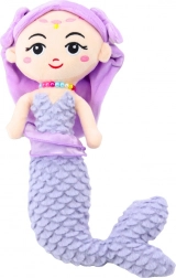 Die Meerjungfrau hat ein elegant besticktes Gesicht und kleine goldene und rosafarbene Akzente auf der Stirn mit lächelnden Augen. Das hellviolette Haar ist mit einem Stoffstirnband mit Schleifen an den Seiten geschmückt und am Hals trägt sie eine bunte Perlenkette. Das gesamte Design wirkt zart und märchenhaft.
