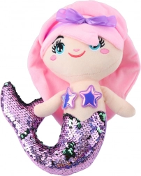 Erleben Sie das Zauberhafte mit dieser Meerjungfrau, die große gestickte Augen und ein lächelndes Gesicht hat. Rosa Haare mit Schleife und ein beeindruckender Schwanz mit zweifarbigen glitzernden Teilen schaffen eine einzigartige Optik. Die glitzernden Teile ändern ihre Farbe von Lila zu Silber bei Berührung und regen die kindliche Fantasie und den Tastsinn an.