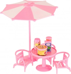 Tisch, Stühlchen und Sonnenschirm schaffen einen gemütlichen Platz für Gäste. Ideal zum Servieren von Eis und Getränken.
