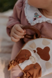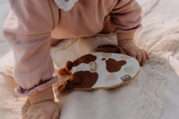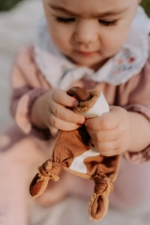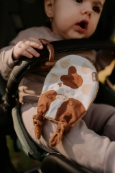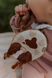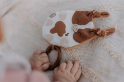 Hergestellt aus hochwertigen Materialien, bietet das Spielzeug Kälbchen viele faszinierende Elemente, die die Sinne der Kleinsten anregen. Die Vorderseite besteht aus bedruckter 100%iger Baumwolle, zertifiziert für Kinder bis 3 Jahre. Die Rückseite aus Bambusfrottee bietet eine weiche und angenehme Oberfläche.