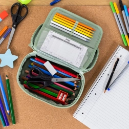 Das Schulmäppchen Etue Menthol ist geräumig mit doppelter Klappe und Innentasche. Das Material ist strapazierfähig und recycelt, und die YKK-Reißverschlüsse bieten eine hervorragende Haltbarkeit. Der Schuhbeutel besteht aus strapazierfähigem, abwaschbarem Material und ist mit robusten Kordeln zum bequemen Tragen auf dem Rücken ausgestattet.