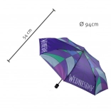 Dieser Regenschirm ist der perfekte Begleiter für alle, die auch bei Regen stilvoll unterwegs sein wollen. Dank seines kompakten Designs ist er leicht transportierbar, was ihn für den täglichen Gebrauch geeignet macht. Die Hülle des Regenschirms mit dem Wednesday-Motiv zieht jedermanns Aufmerksamkeit auf sich. Sie können ihn mühelos in Ihren Rucksack oder Ihre Handtasche verstauen.
