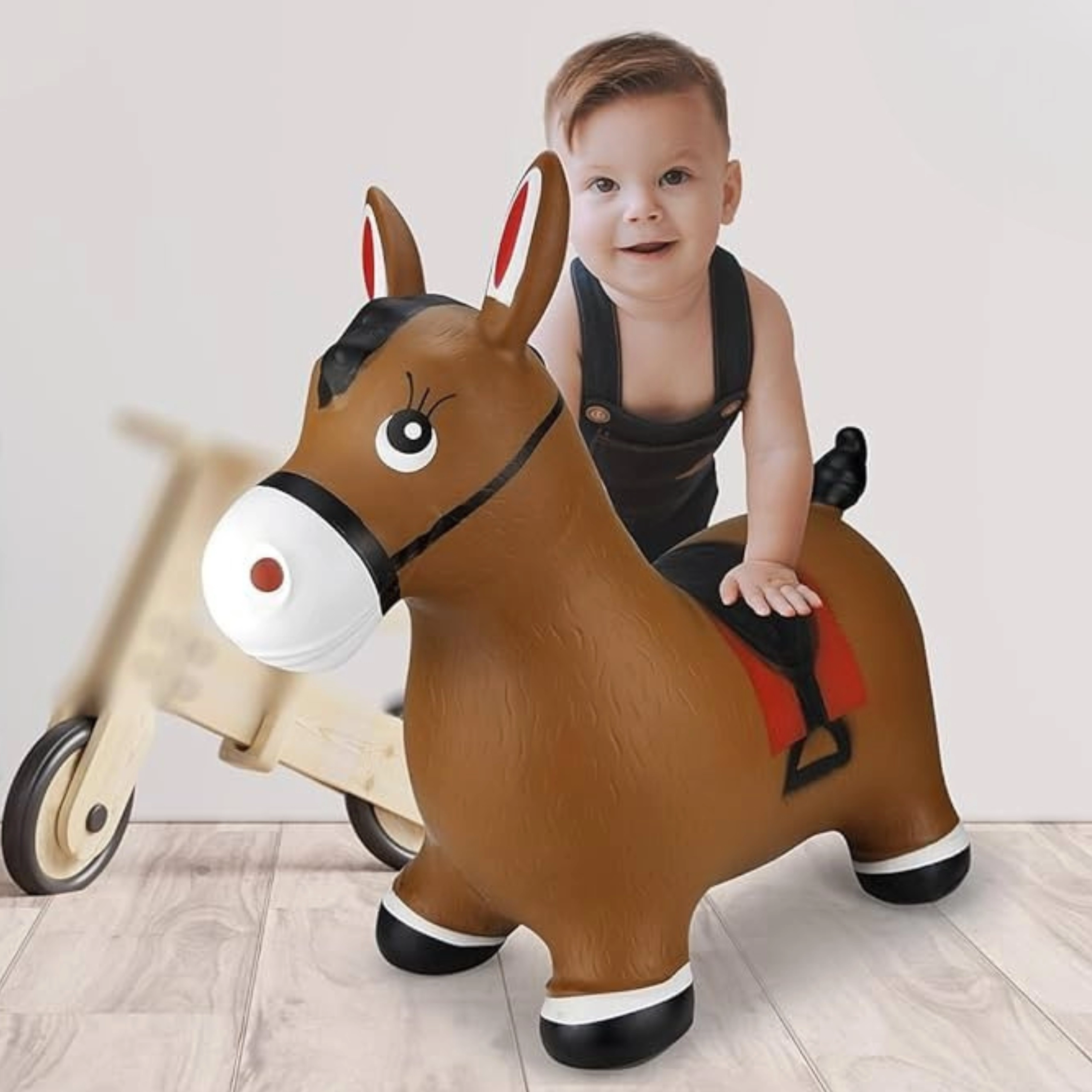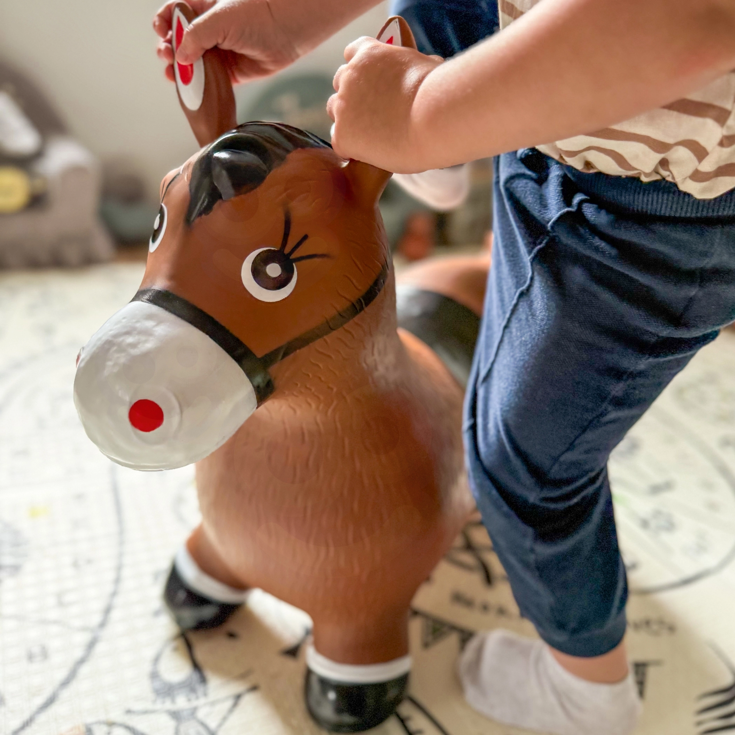 Das klare Design des niedlichen braunen Pferdchens mit Sattel motiviert zum Spielen und regt die Fantasie an. Die maximale Tragkraft beträgt 45 kg und die empfohlenen Fülldrücke 0,3–0,4 bar sorgen für die richtige Elastizität und bequemes Hüpfen. Im Lieferumfang ist eine praktische Pumpe enthalten, sodass der Spaß direkt nach dem Auspacken beginnen kann.