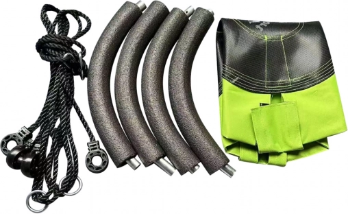 Die Stahlkonstruktion ist mit weichem Schaumstoff überzogen, um die Sicherheit zu erhöhen. Die Schaukel lässt sich leicht an vorbereitete Rahmen, Baumäste oder im Innenbereich an Deckenbefestigungen montieren. Dank starker Seile und robuster Befestigungen trägt sie bis zu 150 kg.