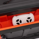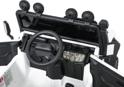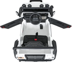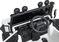 Das Auto ist mit LED-Lichtern (2 Modi) mit Schalter, öffnenden Türen, einem gepolsterten Sitz aus Kunstleder mit Sicherheitsgurten und einer gut sichtbaren Ladezustandsanzeige ausgestattet. Das Multimedia-Panel mit Bluetooth, USB, AUX und MP3 bringt Lieblingsmusik, außerdem gibt es vorinstallierte Melodien und eine Hupe am Lenkrad.
