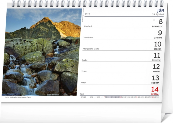Entdecken Sie die herrlichen Ausblicke der slowakischen Landschaft mit dem Tischkalender für das Jahr 2026, der ein Wochenkalendarium mit Namen, Feiertagen und Gedenktagen auf Slowakisch enthält.