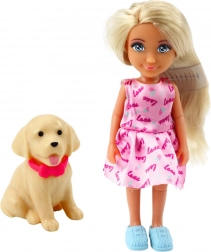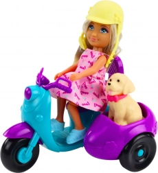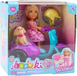 Die Puppe fährt auf einem dreirädrigen Roller in intensiven türkis-lilanen Farben. Der Anhänger an der Seite des Rollers birgt einen kleinen Hund mit rotem Halsband – einen treuen Begleiter auf jeder Reise. Das Set ist aus robustem, sicherem Plastik gefertigt und ideal für tägliches Spielen.