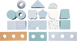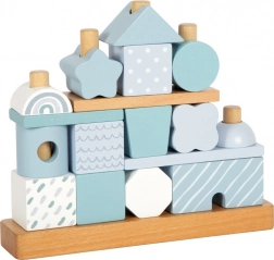 Das Holzhaus zum Stecken von der Marke Small Foot ist in sanften Pastelltönen von Blau mit natürlichen Elementen gestaltet. Mit insgesamt 18 verschieden geformten und verzierten Teilen können Kinder ihre Feinmotorik und Kreativität beim Erstellen unterschiedlicher Varianten des Hauses entwickeln.