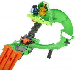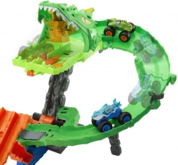Starte ein adrenalingeladenes Duell im Themen-Set „Haie vs. Dinosaurier: Drachenrennen“. Setze beide Trucks in den Doppel-Launcher und schicke sie im Parallelrennen direkt auf das Maul des kybernetischen Drachens zu. Die Sägeblatt-Weiche entscheidet per Zufall, ob die Fahrzeuge stoppen, einer von der Strecke fliegt oder beide durchrasen und den Drachen zu Fall bringen.