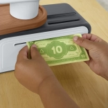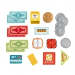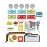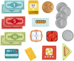 Enthalten sind Geldscheine, Münzen, eine Zahlungskarte und Plastikle-bensmittel – alles für komplette Einkaufsszenarien, Scannen und Bezahlen.