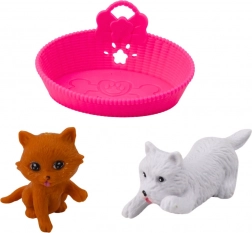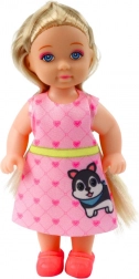 Die Mini-Puppe mit Hund und Katze mit Zubehör ist ideal für kleine Tierpfleger. Die Puppe mit einer Höhe von 12 cm, gekleidet in einem rosa Kleid mit Herzchen, wird von plastischen Tierfiguren begleitet. Das Set enthält: