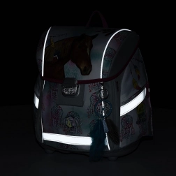 Der Schulrucksack aus der Premium Light Serie mit elegantem Pferdemotiv bietet mehr als nur ein schönes Aussehen. Er besteht aus leichtem Material, wodurch er weniger als 900 g wiegt. Der Rucksack verfügt über eine komfortable, atmungsaktive Polsterung und breite gepolsterte Träger, die das Gewicht gleichmäßig auf die Schultern des Kindes verteilen. Für noch mehr Komfort gibt es Brustgurte und Zugbänder.