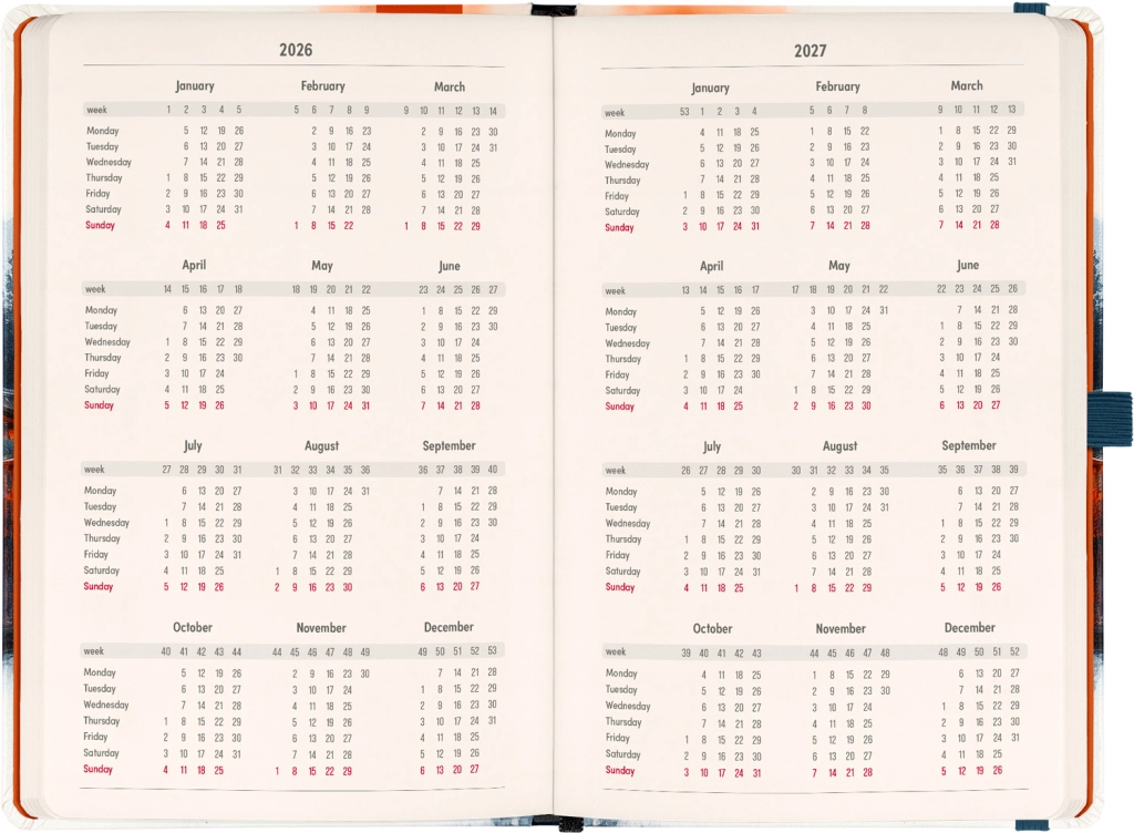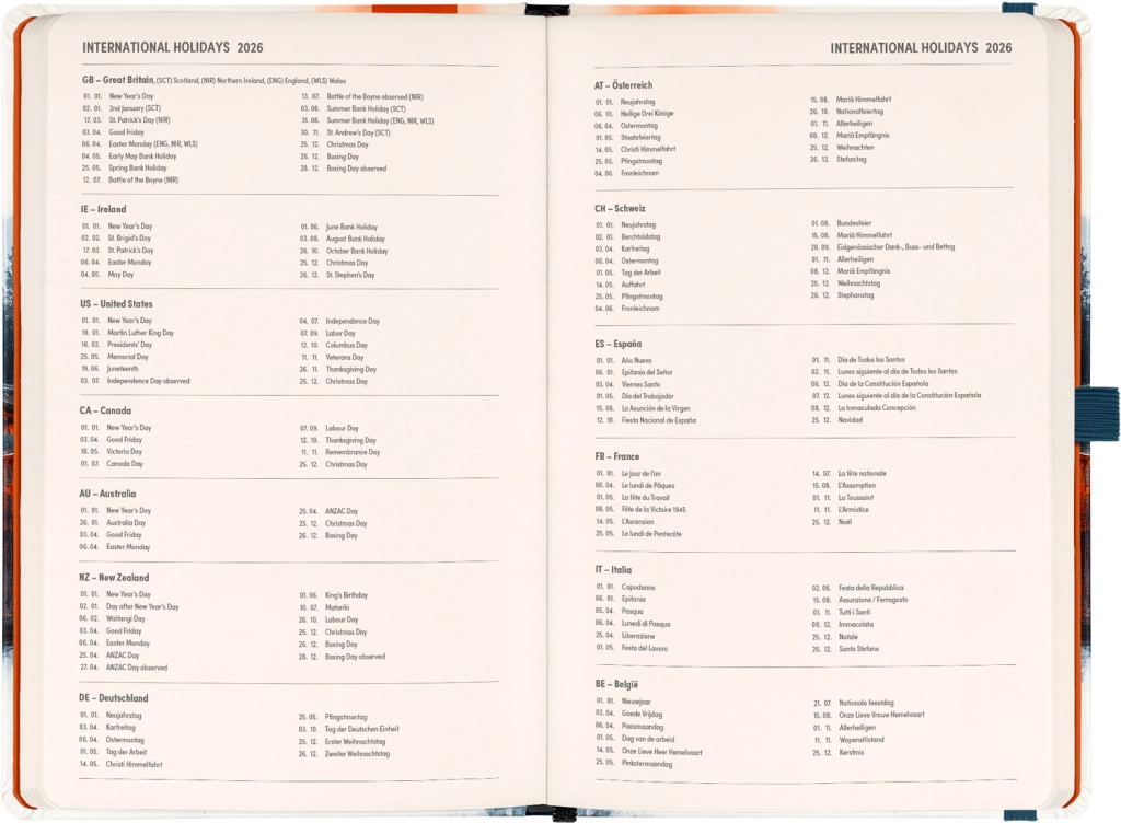 • Kalendarium Teil: Zweiwochen horizontales Kalendarium mit internationalen Feiertagen.