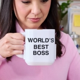 Sorgen Sie für Unterhaltung, indem Sie die Figuren und Accessoires in verschiedenen Szenen in einer stilvollen Tasse mit der Aufschrift "World's Best Boss" platzieren.
