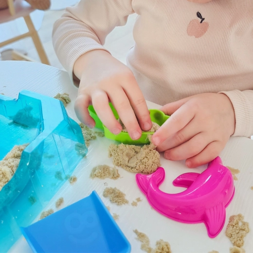 Kinetischer Sand ist weich, angenehm zu berühren, formstabil, trocknet nicht aus und klebt nicht an den Händen – ideal für das sensorische Spiel von Kindern ab 3 Jahren.