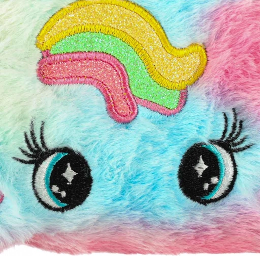 Design inspiriert von einem Einhorn mit Regenbogenmuster und Ohren, ideal zur Aufbewahrung von Kosmetikbedarf.