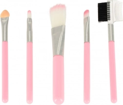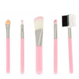 Fünf verschiedene Pinsel mit pinken Griffen und Metallzwingen sind ideal für eine effiziente Anwendung von Kosmetik.