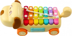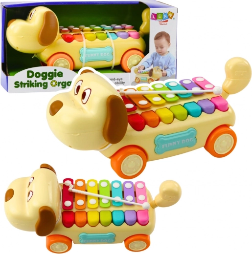 Der rollende Hund ist mit einer vollständigen Reihe bunter Zimbeln ausgestattet, die mit dem mitgelieferten Schlägel zum Klingen gebracht werden können. Dank der Befestigung des Schlägels an der Schnur des Spielzeugs geht dieser auch bei intensivem Spielen nicht verloren. Der Hund ist aus langlebigen und sicheren Materialien gefertigt, seine Konstruktion unterstützt die Entwicklung von Hand-Auge-Koordination, Feinmotorik und Musikalität. Ideal als pädagogisches Spielzeug für Kinder ab 18 Monaten.