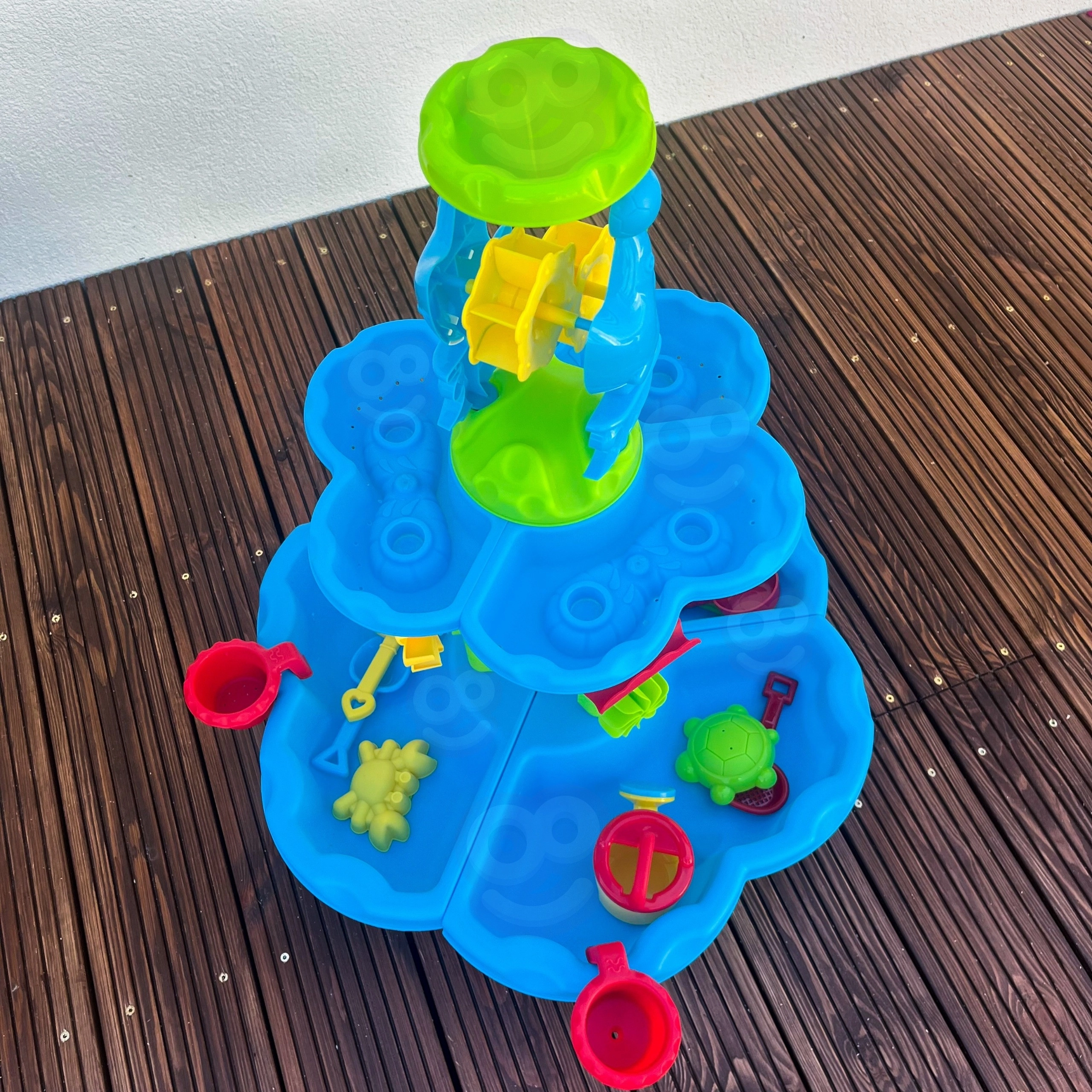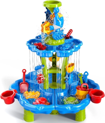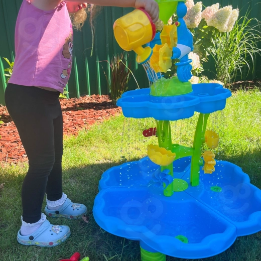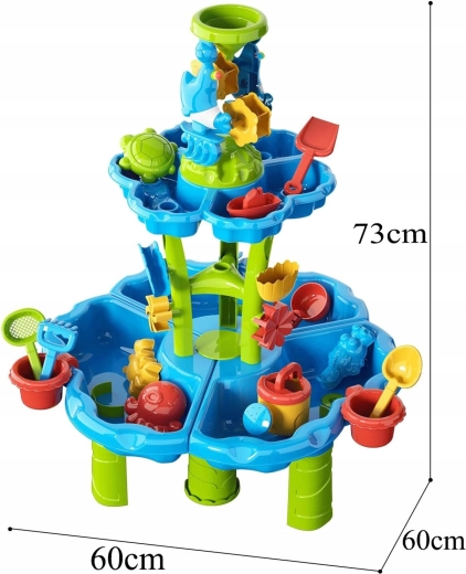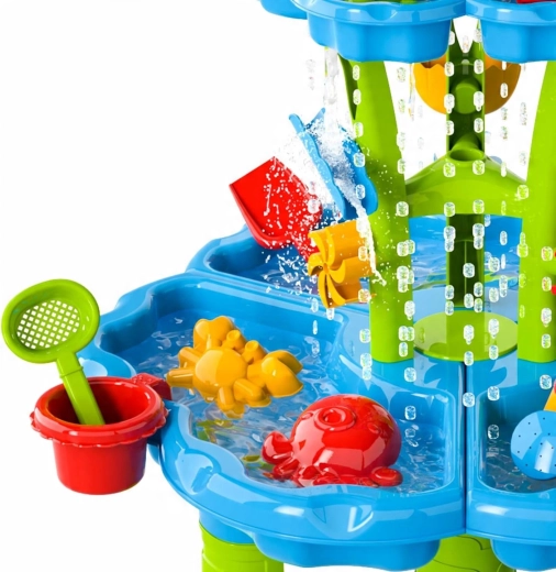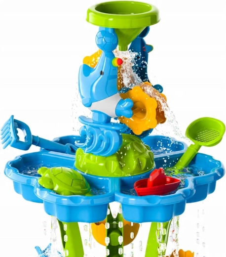 Gestalten Sie für Kinder ihren eigenen Mini-Aquapark. Der Tisch bietet drei separate Kammern – eine können Sie mit Wasser füllen, die zweite mit Sand und die dritte zum Mischen und Experimentieren nutzen. Das Wasser fließt durch kaskadierende Rinnen, setzt Räder in Bewegung und läuft über Tore über, sodass Kinder klare Ursache-Wirkungs-Zusammenhänge erkennen und ihre Feinmotorik entwickeln.