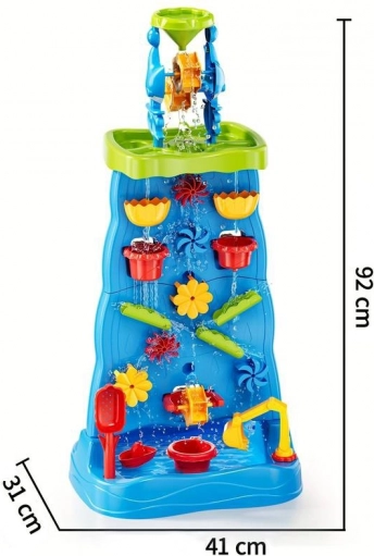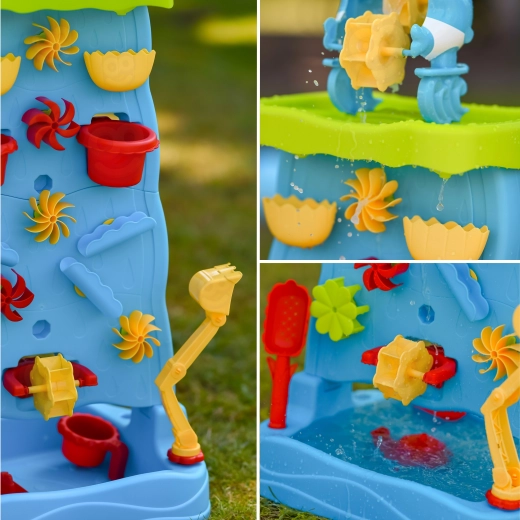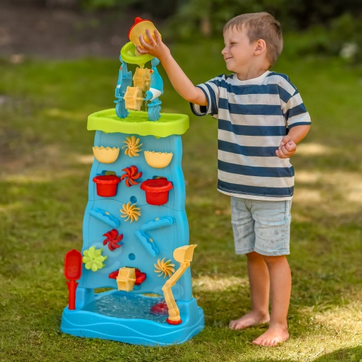 Diese farbenfrohe Wasserwand mit hohem Turm und Kaskaden bietet Kindern endlosen Spaß mit Wasser und Sand. Dank der modularen Konstruktion können sie die Anordnung von Trichtern, Rinnen und Rädern verändern und beim Fließen des Wassers Ursache und Wirkung beobachten. Das beidseitige Design ermöglicht gleichzeitiges Spielen von beiden Seiten – ideal für Geschwister und Freunde.