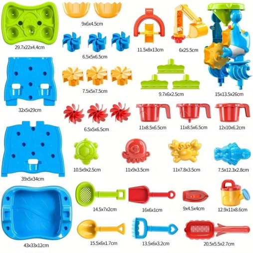 - 2× Schaufel, Harke, 2× Sieb, Gießkanne, Eimer, 4× Förmchen, 5× Wasserbecher, 10× Wasserrad, doppeltes Wasserrad mit Trichter, 3× Rinne