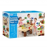 Das Set umfasst einen Piratenturm mit Ausguck, eine Piratenfigur, einen Anker, Becher zum Umfüllen sowie schwimmende Tierchen, die sensorisches Spiel, Hand-Auge-Koordination und Kreativität fördern. Die große Fläche ermöglicht bequemes gemeinsames Spielen mehrerer Kinder und die einfache Konstruktion erleichtert das Ablassen des Wassers sowie die Pflege.