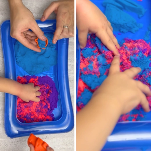 Das kompakte, aufblasbare Tablett hält den Sand zusammen, sodass Kinder kreativ sein können, ohne dass etwas auf Boden oder Tisch landet.