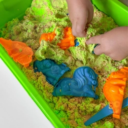 Kinetischer Sand ist angenehm weich, formstabil, klebt nicht an den Händen und bietet ein beruhigendes sensorisches Erlebnis beim Kneten und Pressen.