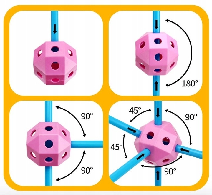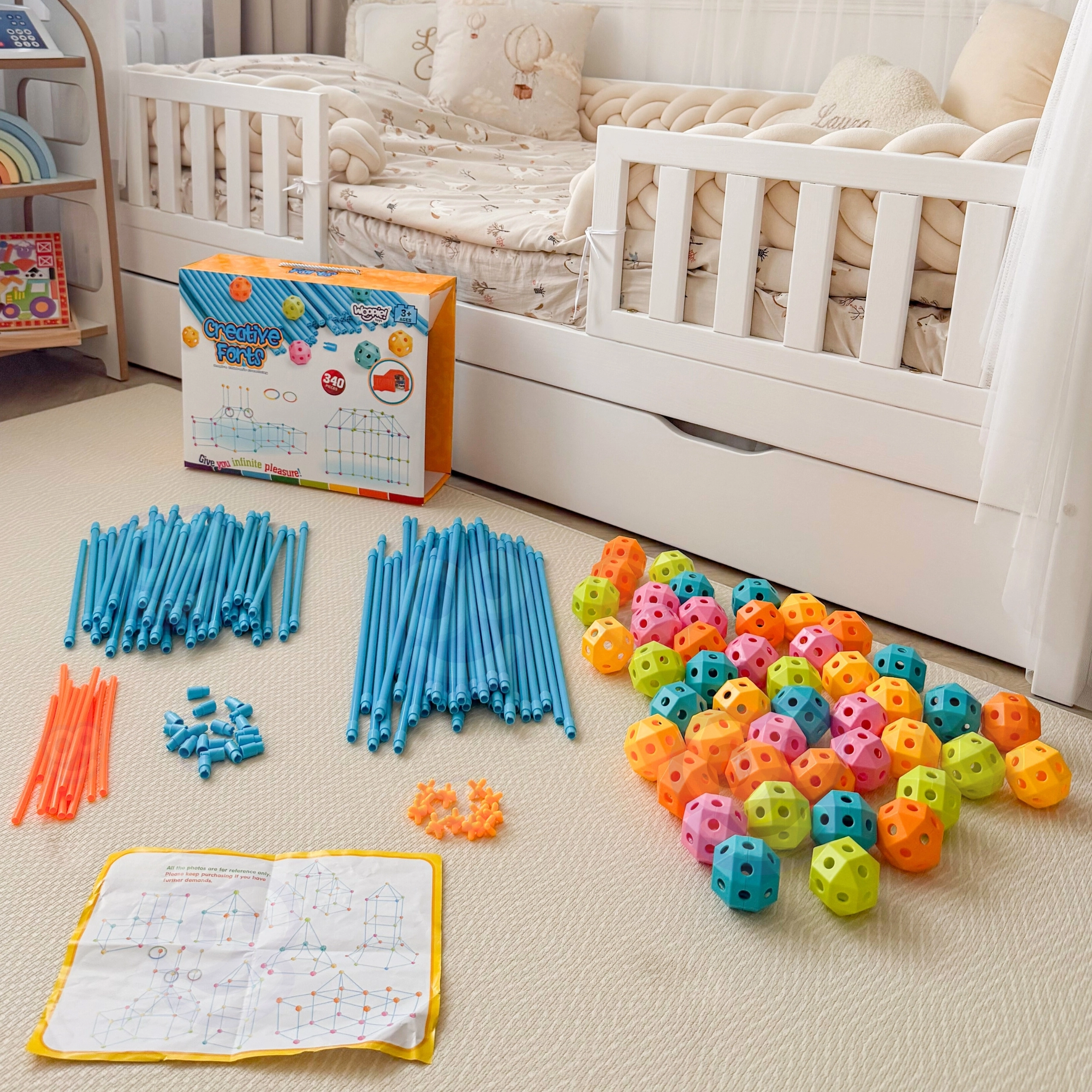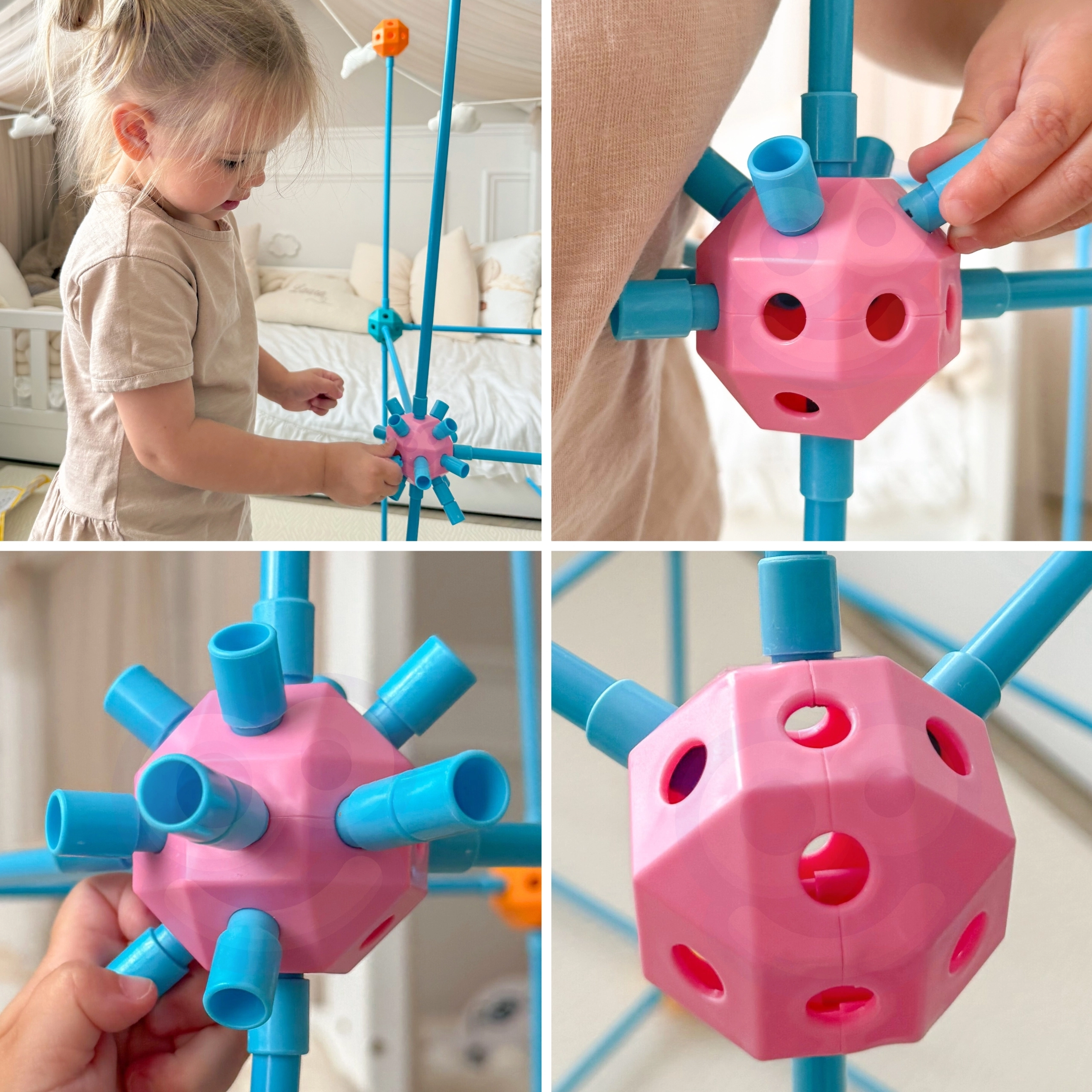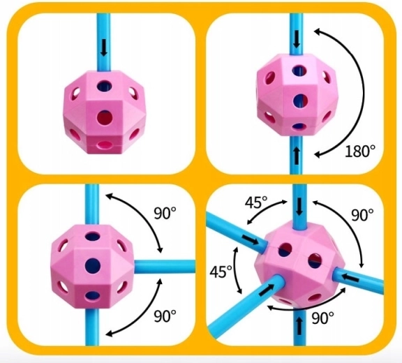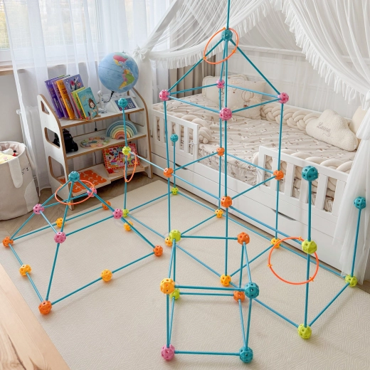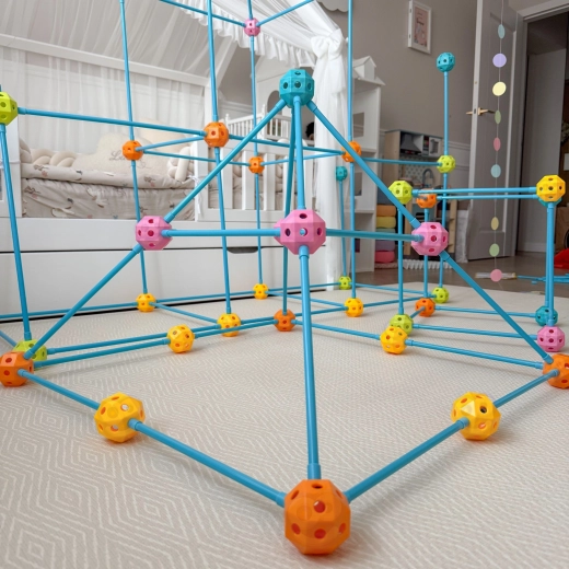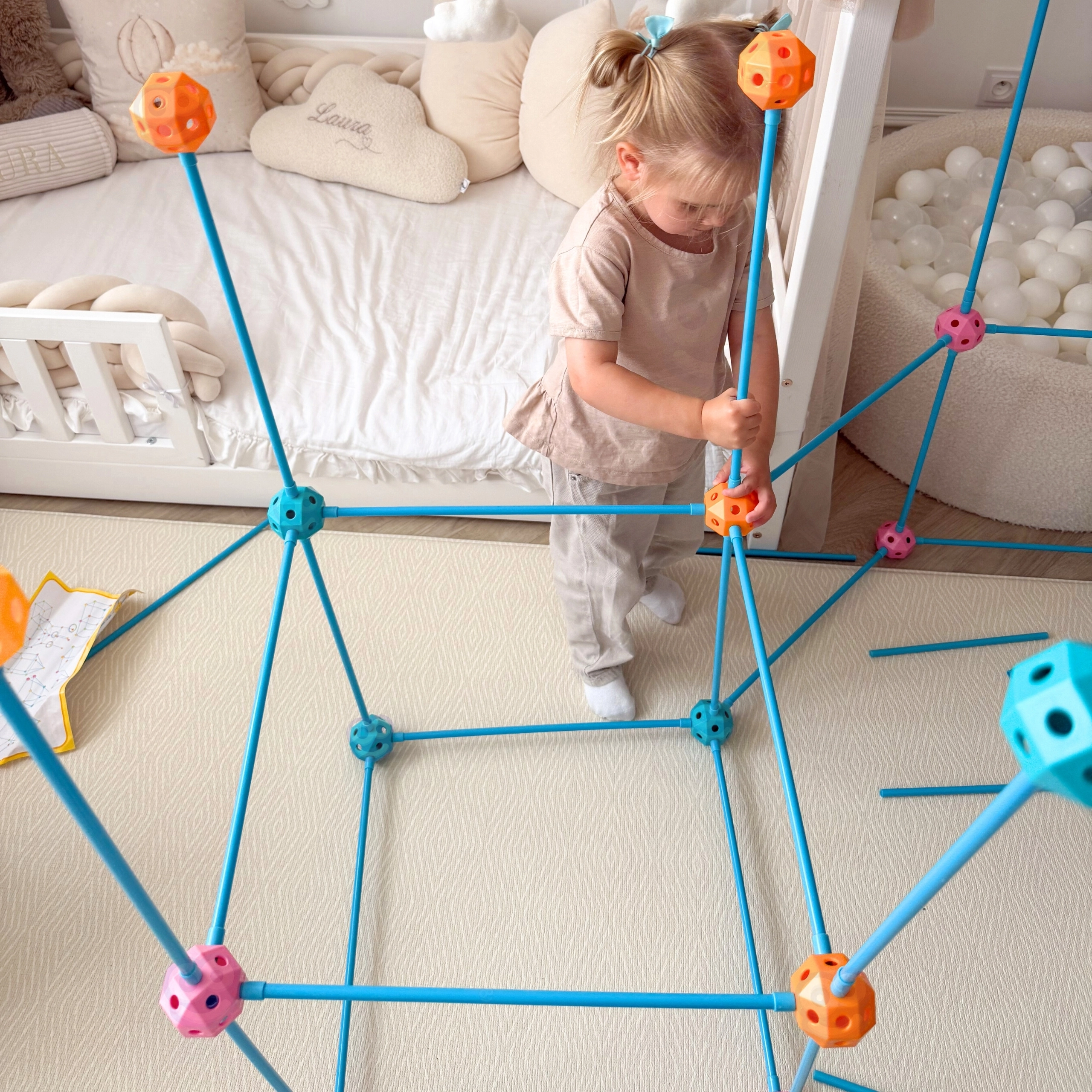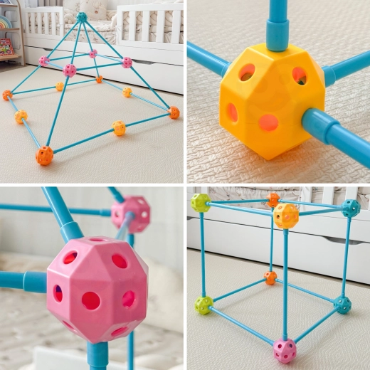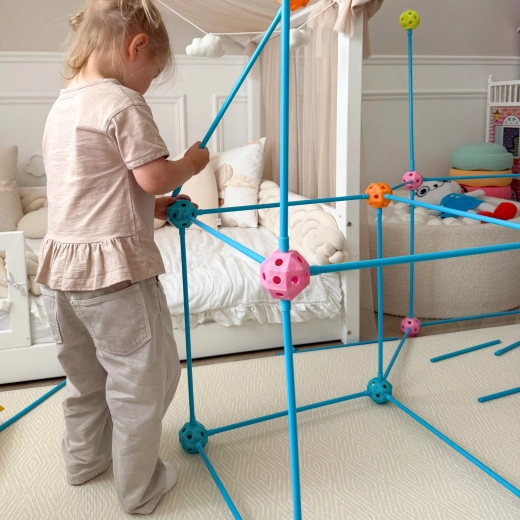 Lange Stäbe und Kugeln mit mehreren Öffnungen ermöglichen feste Verbindungen in verschiedenen Winkeln. Kinder bauen mühelos Türme, Kuppeln, Häuschen und Labyrinthe.