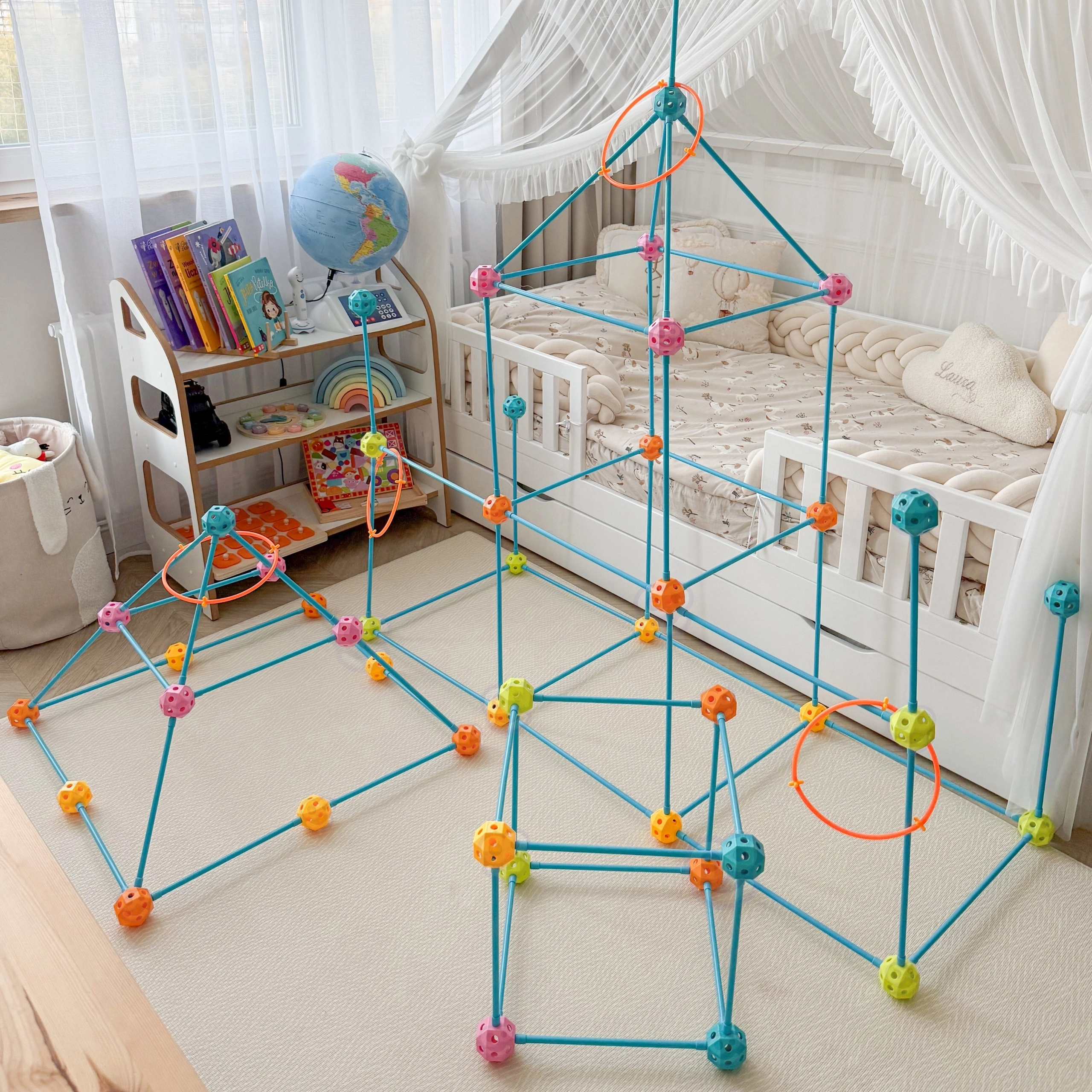 Der WOOPIE-Baukasten lässt Kinder in die Rolle kleiner Architekten schlüpfen. Blaue Stäbe und farbige Kugelverbinder mit Öffnungen für mehrere Winkel (45°, 90°, 180°) ermöglichen stabile und kreative 3D-Formen. Decken Sie die Konstruktion mit der Plane ab, und im Handumdrehen entsteht ein gemütlicher Bunker zum Spielen und Ausruhen.