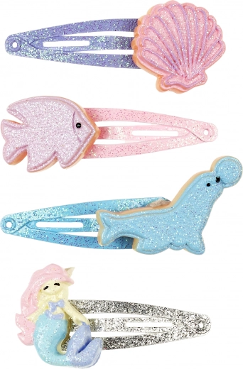 Set von vier glänzenden Haarklammern mit Märchenmotiven wie Meerjungfrau, Robbe, Fisch und Muschel, die deiner Frisur einen zauberhaften Touch verleihen.