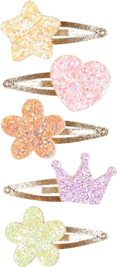 Dieses wunderschöne Set von Haarspangen enthält fünf Stück mit glitzernden Verzierungen in Form von Stern, Herz, Blume und Krone. Die Spangen sind einfach zu verwenden dank des Klickmechanismus, der sicherstellt, dass sie den ganzen Tag an Ort und Stelle bleiben. Sie sind das ideale Haaraccessoire für jedes kleine Mädchen.