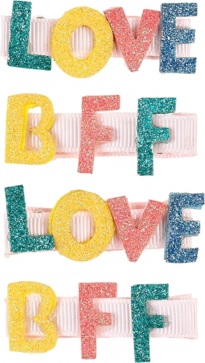 Ein Set von vier einzigartigen Haarspangen, die ein stylisches Accessoire für Ihr Kind darstellen. Jede Spange hat einen Metallteil, der mit einem Ripsband überzogen ist, was ihre Haltbarkeit und Eleganz erhöht. Dank des leicht geriffelten Griffs bleiben die Spangen fest im Haar und rutschen nicht.