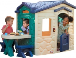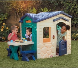 Das Haus hat Türen zum Öffnen mit einem Briefkastenschlitz, wo Kinder Post spielen können.