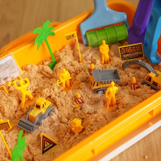Dieses kreative Bauset mit kinetischem Sand bringt realistischen Bauspaß nach Hause. Die tragbare Tablett-Basis mit erhöhtem Rand hält den Sand zusammen, während Mini-Bagger, Kipper, Walzen, Figuren und Verkehrsschilder Kindern helfen, ihre eigene Baustelle zu erschaffen. Kinetischer Sand klebt nicht an Händen oder Boden und ist ungiftig.