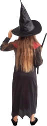 Das Kostüm umfasst ein schwarzes und rotes Kleid mit langem Schnitt und detaillierter Schnürung, die einen authentischen Hexenstil schafft. Perfekt für Halloween oder Karnevalsfeiern.